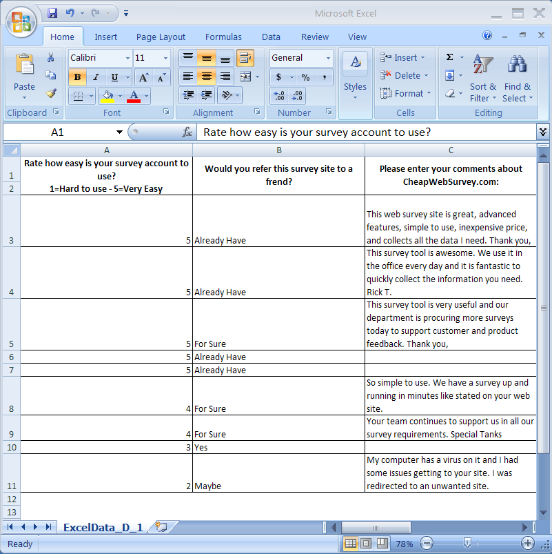 Export your survey information at any time and as much as you want. This screen shot is a view of the survey information exported into an Excel spreadsheet.
